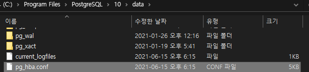 4. pg_hba.conf 파일을 md5로 다시 수정