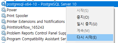 2. PostgreSQL 서비스를 재기동(윈키+R > services.msc 입력)