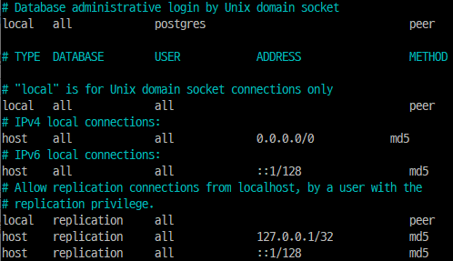 1. sudo nano /etc/postgresql/12/main/pg_hba.conf 명령을 통해서 md5를 trust로 수정
