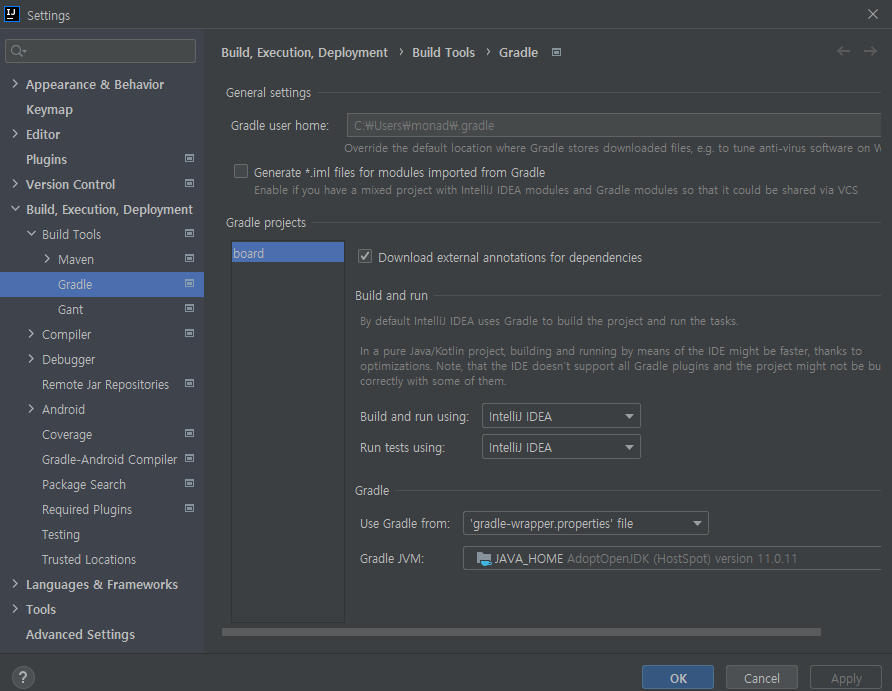 2. Build, Execution, Deployment에서 Build and run using: 과 Run tests using: 을 Gradle로 변경하여 적용
