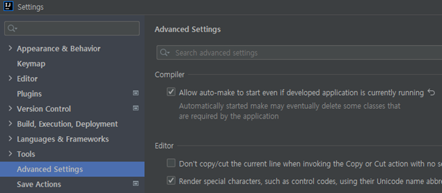 이전 버전의 설정(Ctrl+Shift+A): compiler.automake.allow.when.app.running